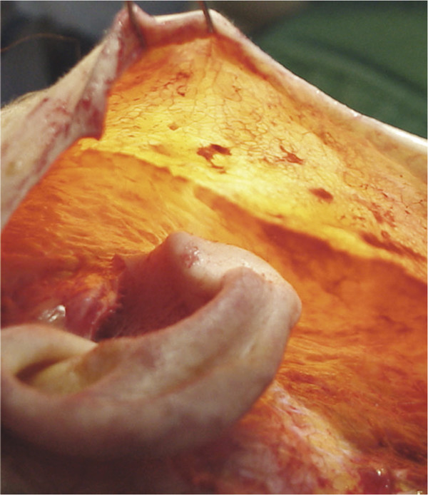 Although the general thickness of subcutaneous tissue varies from person to person based on age and weight, there is a proper thickness for skin-flap undermining, especially when performing a lamellar dissection. When beginning skin-flap undermining in the cheek, the flap must be relatively thin so as to avoid including SMAS fibers in the skin flap, which will render the SMAS flap too thin and therefore useless. If dissection is in the proper plane, the fat on the undersurface of the flap will have a rough, “cobblestone” appearance to it, which is more visible when the flap is transilluminated (Fig. 1.1). When the dissection is too deep, the undersurface will look smooth and contain streaks of fine white tissue; when it is transilluminated, this flap will appear thicker and “cloudy.” When beginning skin-flap undermining in the postauricular area, it is important to understand that, superiorly and anteriorly, there is little subcutaneous fat between skin and fascia, which makes it difficult to establish the correct subcutaneous plane. Beginning the dissection more posterior and inferior, the surgeon will encounter more subcutaneous fat and establish the correct plane more easily, facilitating dissection of the postauricular flap and lateral neck. Unlike the cheek-skin flap, which should remain thin, the neck flap should be slightly thicker to help avoid an, overresected appearance in the neck. 1