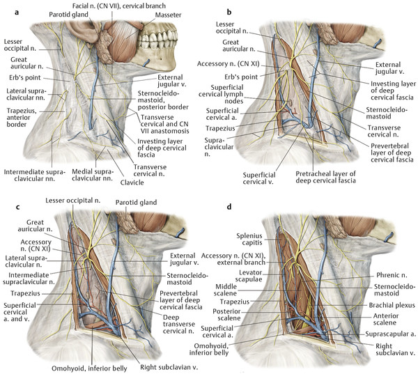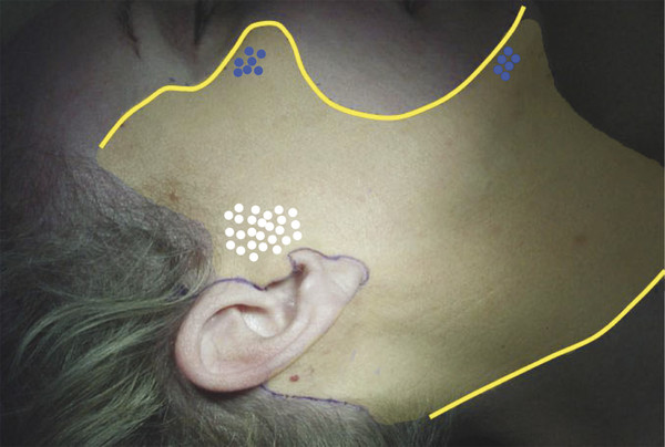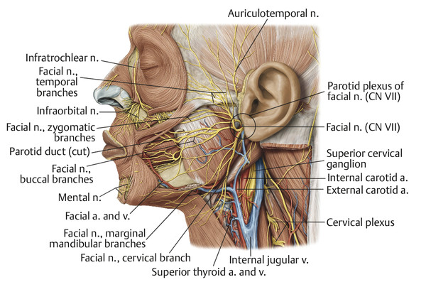 The marginal mandibular branch exits the parotid approximately 4 cm beneath the base of the earlobe, near the angle of the mandible. In most cases, it courses above the inferior border of the mandible, and in all cases where it is anterior to the point where the facial vessels cross the mandibular border, it courses above the inferior border of the mandible. In 19% of cases, it lies up to 2 cm below the mandibular border posterior to the facial vessels. 11 In these cases, the nerve travels superiorly and will cross over the facial vessels as it continues above the level of the mandibular border. These vessels are palpable at the anterior border of the masseter and serve as a useful landmark for locating the marginal mandibular branch. This location is also likely to be where the nerve is at greatest risk for injury because the covering platysma and superficial fascia are thinner and the nerve is more superficial crossing over the facial vessels. In general, any subplatysmal dissection should proceed cautiously over the region of the angle of the mandible to prevent marginal mandibular branch injury.