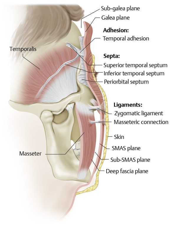 The SMAS represents the superficial fascia of the face and forms a continuous layer throughout the face and neck. The SMAS is contiguous with the superficial cervical fascia inferiorly in the neck. Superiorly past the zygomatic arch, it becomes the temporoparietal fascia in the temple and then the galea in the scalp. 6 The SMAS layer varies in thickness from one area of the face to another. It is dense and thick over the parotid gland, and it is this portion that is most commonly understood by surgeons as clinically representing the SMAS. As the SMAS is traced medially, it is thinner and less distinct over the masseter and buccal fat pad. In the malar region, the SMAS is also thin and ultimately blends into the epimysium of the upper lip elevators. The layer deep to the SMAS is the parotid–masseteric fascia (deep facial fascia). This layer in the cheek is made up of the parotid capsule over the parotid gland and continues anteriorly to form the fascial layer over the masseter muscle. The significance of this layer is that branches of the facial nerve always lie deep to this layer in the cheek. Recognizing the importance of this point and being able to identify this layer allow safe, extensive mobilization of the SMAS superficial to it.
