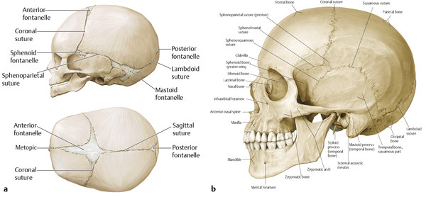 Fig. 1.1 Cranium. (a) Vertex view. (b) Lateral view. (From THIEME Atlas of Anatomy, Head and Neuroanatomy, © Thieme 2010, illustration by Karl Wesker.)