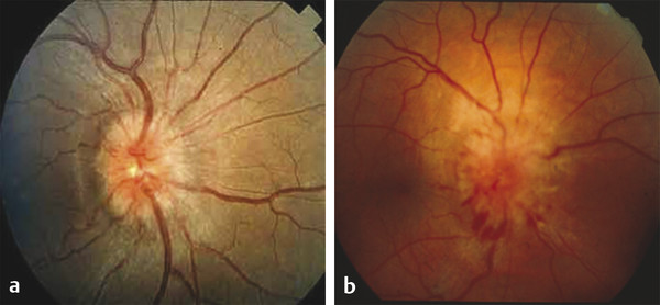 Fig. 1.3 Optic disc. (a) Normal. (b) Papilledema with blurring of the disc edges.