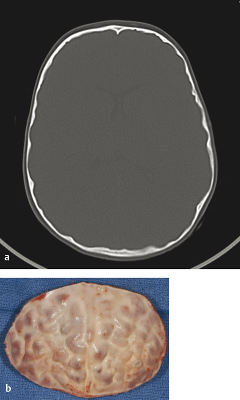 Fig. 1.4 Endocortical erosions. (a) CT findings. (b) Intraoperative view of the frontal bone with endocortical scalloping.