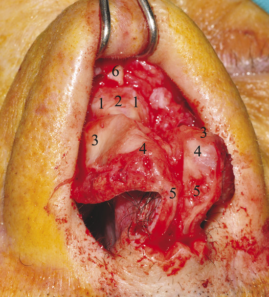 The bony framework of the piriform aperture represents the insertion of the cartilaginous structures supporting the nasal pyramid: upper lateral cartilages (ULCs) and lower lateral cartilages (LLCs). The ULCs are triangle shaped. Its superior insertion is under the nasal bones where they are strongly attached. Medially, its edge merges with the nasal septum and the contralateral ULC at the keystone area (Fig. 1‑2). This union with the nasal septum shapes a decreasing angle in the nasal cavity from superior to inferior (from 70 to 10–15 degrees), which is of paramount importance to determine the nasal airflow. At this point, between the nasal septum, ULC, the head of the middle turbinate, and the floor of the nasal cavity, the coronal section is called “nasal valve” as it constitutes the place of maximal resistance to nasal airflow. Values of this valvular nasal angle under 10 degrees may result in nasal obstruction. 1 The vertex of the ULC is inserted laterally in the frontal process of the maxilla. The inferior edge of the ULC is placed under the superior edge of the LLC crus lateralis. The LLC is horseshoe shaped and has three portions: crus medialis, crus lateralis, and intermediate crus or dome. This cartilage is the main support to the nasal vestibule that is the natural entry to the nasal cavity. Because of its fibroelastic insertions to the bony framework of the piriform aperture and to the musculocutaneous components of the nasal pyramid, it offers a significant elasticity that facilitates the indispensable maneuvers for the endoscopic approaches to the nose.