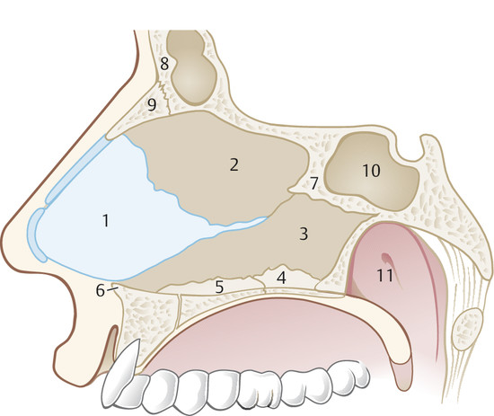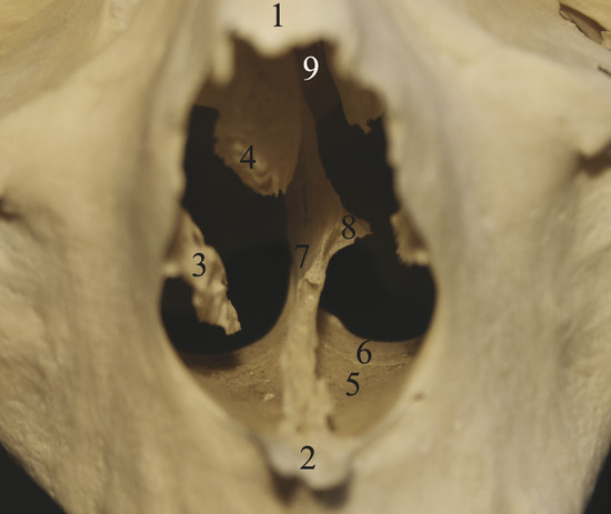 The piriform aperture acts as the door to the bony structures of the nose. Its boundaries are superiorly the inferior edge of both the nasal bones, laterally the nasal (ascending) processes of the maxilla, and inferiorly the horizontal processes of the maxillary bones. The junction between the latter ones forms the anterior nasal spine, a keel-shaped protrusion in which the nasal septum is firmly attached (Fig. 1‑1).
