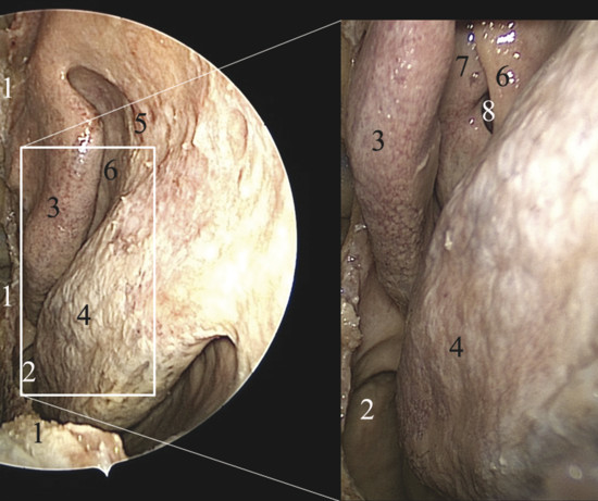 To systematize the surgical endoscopic anatomy of the nose, we approach each nasal cavity as a hexahedron. The anterior and posterior walls of the cube are the nares and the choanae, respectively, the medial wall is the nasal septum, the lateral wall is the homonymous part of the nose, the inferior wall is the nasal floor, and the superior wall is the nasal vault.