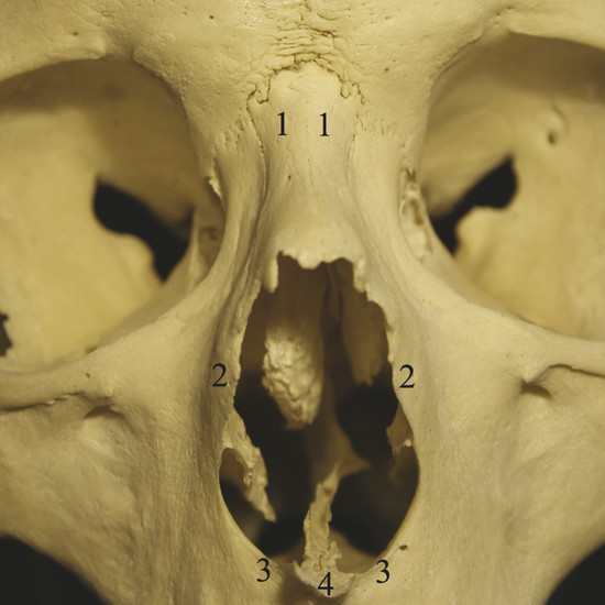 The piriform aperture acts as the door to the bony structures of the nose. Its boundaries are superiorly the inferior edge of both the nasal bones, laterally the nasal (ascending) processes of the maxilla, and inferiorly the horizontal processes of the maxillary bones. The junction between the latter ones forms the anterior nasal spine, a keel-shaped protrusion in which the nasal septum is firmly attached (Fig. 1‑1).