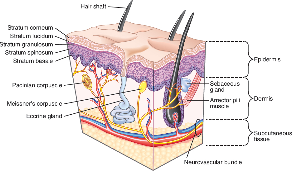 The skin is a complex organ and serves many important functions. It allows for interaction with the environment, while also protecting from injury. It is essential for wound healing, provides sensation, helps regulate body temperature, is a permeability barrier, protects from ultraviolet (UV) radiation and infection, and is responsible for much of an individual’s physical appearance. Because the skin is transected and manipulated in essentially every surgical procedure, it is important for the surgeon to understand its structure and various functions.