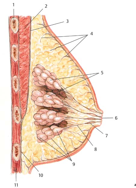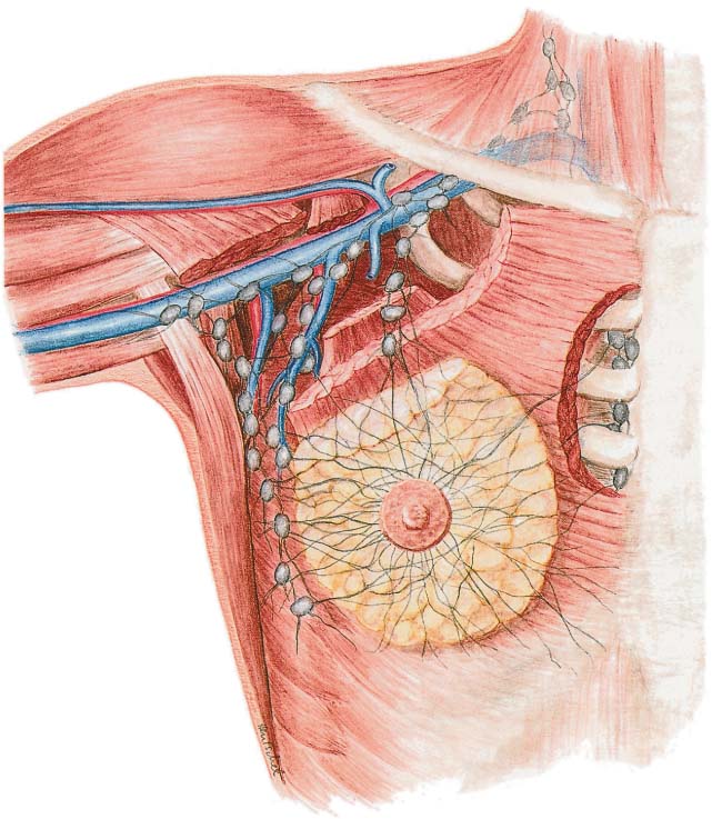 Tumor resection should be carried out with consideration of the radial arrangement of the lobules, ductal system, and lymph vessels of Cooper’s ligaments ( Fig.10.1 ). The anatomy of the breast thus makes segmental resection the most logical method of removing the tumor. All of the breast tissue, from the subcutaneous tissue to the pectoralis fascia, should be excised. Merely removing the lesion from the parenchyma is too imprecise and should be avoided.
