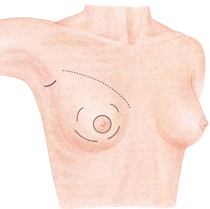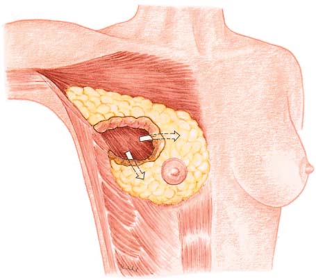 If the tumor is palpable, a curvilinear incision is made in the overlying skin (or nearby), followed by wide subcutaneous dissection of the parenchyma surrounding the tumor ( Fig.10.2 ). A periareolar incision is preferable when possible. The skin incision should not be carried into the cleavage area. A more direct surgical route is usually unnecessary, due to the subsequent radiotherapy; at most, it can be used to obtain better exposure of the surgical field. Resection of a skin ellipse is only indicated if there is skin infiltration or tethering.