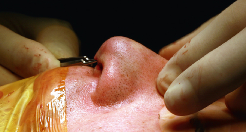 When the central part of the nose (i.e., the columella and the tip lobule) is lengthened with a septal extension graft, the lateral crus moves vertically upward and so does the alar margin. The alar margins also need to be lowered to create a more balanced nostril after the placement of the septal extension graft. Slight imbalance can be adjusted with a lateral crural onlay or strut graft. Placing a long lateral crural strut graft–lateral crural complex into a pocket made in the piriform aperture may lower the alar margin in the thinskinned Caucasian patient, but this maneuver is not as effective for East Asians, who have thicker skin. In most cases, the stiff and inelastic skin envelope and deficient vestibular skin are the most commonly encountered limiting factors during the lowering procedure of the alar rim. The author prefers to use conchal composite grafts from the cymba concha to fill the gap between the elongated skin envelope and the deficient vestibular mucosa, at the same lowering the alar margin (Fig. 10.3c ).