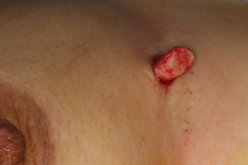 The costal cartilage graft is harvested mostly from the sixth or the seventh rib for use in rhinoplasty. In female patients, the incision is placed just above the inframammary crease for better cosmesis (Fig. 10.4). In male patients, the incision is made directly over the chosen rib. The proper cartilage is located after palpation, and the costochondral junction is confirmed by serial probing with a 26-gauge needle. Marking is usually 1.5 to 2.0 cm in length in thinskinned patients and 2.0 to 2.5 cm in thick-skinned patients. A local anesthetic is infiltrated at the incision site. Ten minutes after injection, the skin and subcutaneous tissue is incised with a no. 10 blade. The subcutaneous fat is alternately separated and retracted using Senn retractors until the fascia and the external oblique muscle layer are exposed. The fascia is then incised and the muscle fibers separated with Kelly or mosquito forceps. To adequately expose the surgical field, the muscle layer is retracted with an Army-Navy retractor for better visualization, instead of cutting with a Bovie, to minimize postoperative pain. The perichondrium and the rib are sufficiently exposed after retracting the soft tissue and muscle.