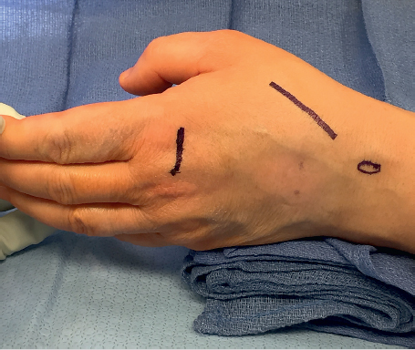 Fig. 10.1 Lister tubercle and both incisions are marked on the hand. Note the abnormal resting position of the thumb in full flexion at the interphalangeal (IP) joint.
