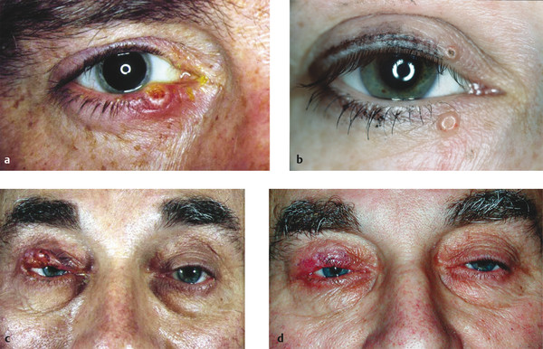 Malignant eyelid tumors are diagnosed early only if a high degree of clinical suspicion is applied when examining all eyelid lesions. A classification of benign and malignant eyelid tumors is provided in Table 10‑1.