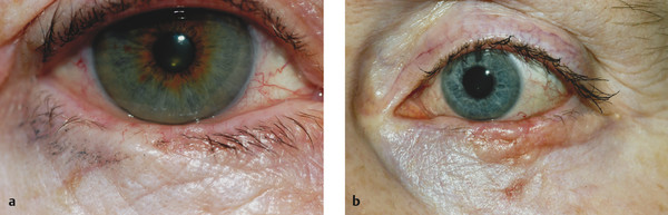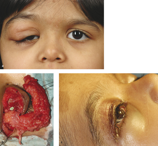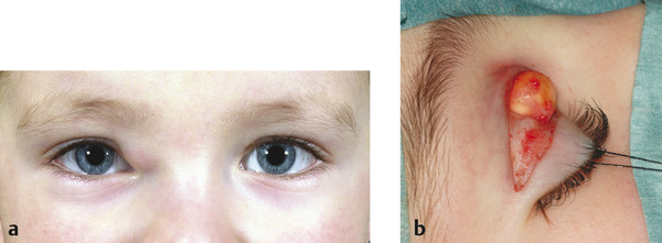 Treatment of a dermoid cyst consists of complete surgical excision. Most lesions can be removed via an upper lid skin crease incision, avoiding a visible scar (Fig. 10‑11a,b). Care should be taken to ensure that the cyst is removed completely and without rupturing the cyst wall. The (off-label) intralesional injection of Tisseel can greatly assist the removal of such lesions. Such an injection results in a solidification of the cyst, making the dissection easier to perform and avoiding the risk of rupture with spillage of cyst contents. It is important to inform the histopathologist that this has been used. Great care should also be taken to avoid intraoperative damage to the trochlea when removing a medial canthal dermoid cyst.