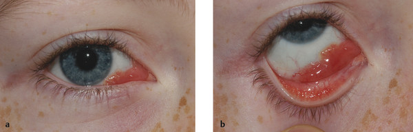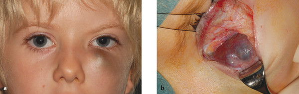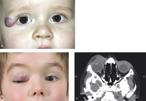 The clinical appearance varies with the depth of the lesion. The lesion may present as a superficial cutaneous lesion (a strawberry hemangioma), a subcutaneous lesion, an orbital lesion, or a combination of all three (Fig. 10‑16a). Initially the hemangioma typically presents as a flat red lesion with overlying telangiectases and then grows into a red, elevated soft painless compressible mass. A subcutaneous hemangioma presents as a bluish-purple mass. The extent of the lesion may need to be determined by imaging using CT, magnetic resonance imaging (MRI), or ultrasound scanning. Great care should be taken to differentiate such lesions from other more sinister mimicking lesions (Fig. 10‑16b).