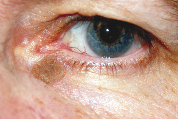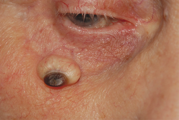 Alternatively, the clinical pattern of some malignant eyelid tumors can simulate other tumor types; for example, pigmented eyelid tumors are much more commonly basal cell carcinomas (BCC) than melanomas (Fig. 10‑2).