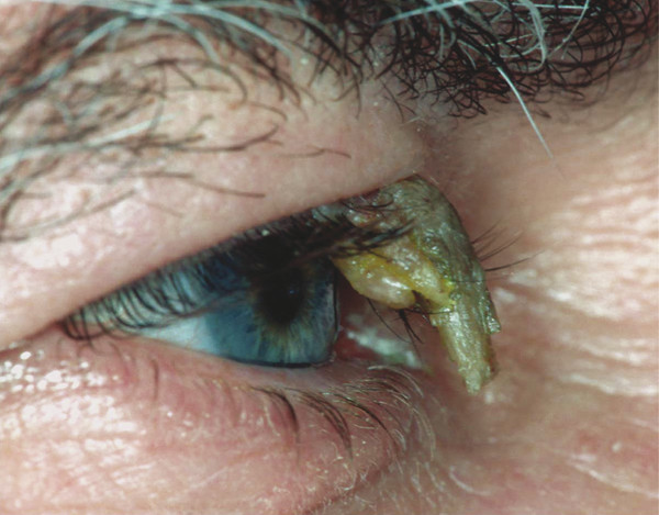 Cutaneous horn is the term used to describe a protuberant projection of packed keratin that resembles a horn seen in animals (Fig. 10‑8). It is more common in elderly patients. The horn can be associated with a number of benign, premalignant, and malignant lesions at its base, and the underlying diagnosis may be masked. Any such horn should raise the suspicion that the underlying lesion may be a squamous cell carcinoma (SCC). A cutaneous horn may also be associated with verruca vulgaris, actinic keratosis, seborrheic keratosis, inverted follicular keratosis, tricholemmoma, and BCC.