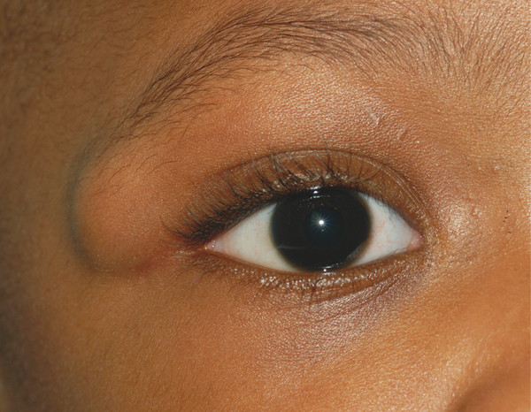 Most dermoid cysts are discovered in childhood and are located over the frontozygomatic suture (Fig. 10‑10). They can occur in the superomedial aspect of the eyelid or orbit, where they must be differentiated from a meningocele or meningoencephalocele by means of computed tomography (CT). Any dermoid cyst with suspected intraorbital extension should be scanned before surgical intervention.