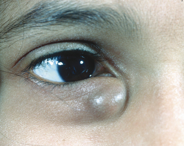A dermoid cyst is a choristoma that results from the sequestration of skin during embryonic development. Continued secretion by sebaceous and sweat glands contained within the lesion causes a gradual increase in the size of the cyst. The cyst also contains hairs. The cyst is present at birth but may not become evident until adulthood. The cyst may lie outside the orbit but may have an extension into the orbit. A “dumb-bell” dermoid cyst has an orbital extension and an extraorbital extension, usually positioned over the lateral orbital wall. Rupture of the cyst releases secretions that are highly irritant and cause an acute inflammatory reaction.