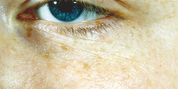 Milia are small, raised, round, white, well-circumscribed, superficial keratin cysts (Fig. 10‑13). They are caused by occlusion of pilosebaceous units. These commonly occur in the eyelids. They are particularly common in newborn babies. They may occur spontaneously or can occur after trauma or treatments such as chemical peeling. As in the previous example, milia may be seen in young patients with Gorlin’s syndrome (basal cell nevus syndrome).