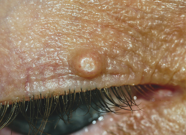 The term papilloma is used to describe any lesion that exhibits a papillomatous growth pattern (i.e., a smooth, rounded or pedunculated elevation). The term squamous papilloma is used to describe any papilloma that has a nonviral cause. This is the most common benign eyelid lesion and occurs most in patients older than 30 years. Eyelid papillomata present as single or multiple small flesh-colored sessile (Fig. 10‑4) or pedunculated growths with a central vascular core that bleeds readily on removal of the lesion.