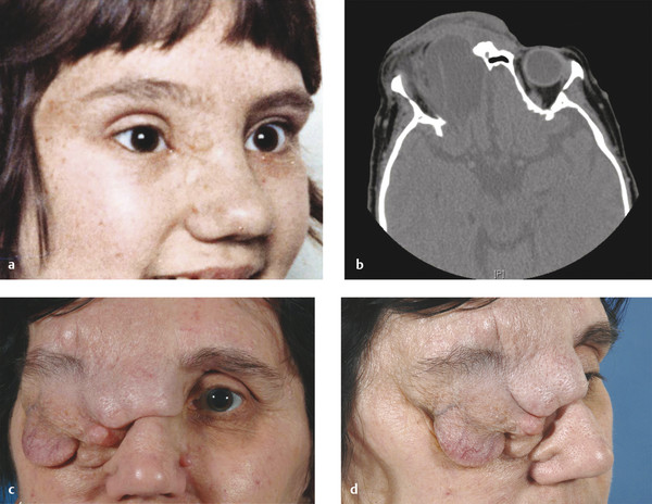 Plexiform neurofibromas are extremely difficult to manage because of their infiltrative growth pattern and vascularity. Surgical debulking may improve the patient’s visual function and cosmetic appearance, but this usually has to be repeated at regular intervals. The surgery can be very difficult. The surgeon should be prepared to manage a significant secondary soft tissue volume deficit, because the external appearances can belie the full extent of the lesion (Fig. 10‑20). The surgeon should obtain consent in advance for the use of primary fat grafting.