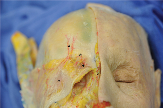A cadaveric dissection showing pertinent arteries and muscles in the glabellar and brow region is shown in ▶ Fig. 10.2 .