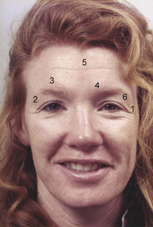 The terms browlift and forehead lift imply that aging in the upper face consists only of eyebrow ptosis. Forehead rejuvenation is a better term. Descent of the eyebrow does occur; however, it is only one component of aging. Fig. 10.1 demonstrates changes seen in the aging upper face, including an upper eyelid skinfold laterally off the lid, glabellar frown lines, transverse forehead creases, large corrugator muscles, transverse nasal creases, low-lying eyebrows, a low lateral brow, and pseudoblepharochalasis.