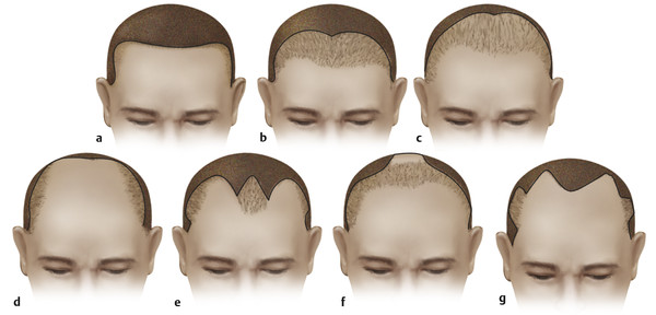 For men with occipital baldness and sparse anterior hairlines, the preceding incision is modified to a “paddle-type incision” (Fig. 10.2 f). This incision pattern allows reduction of the balding area at the crown by simultaneous excision of the bald scalp and advancement of hair-bearing scalp. For men with thicker anterior hairlines who prefer its preservation, an anterior hairline incision pattern (Fig. 10.2 a, e, g) is selected.