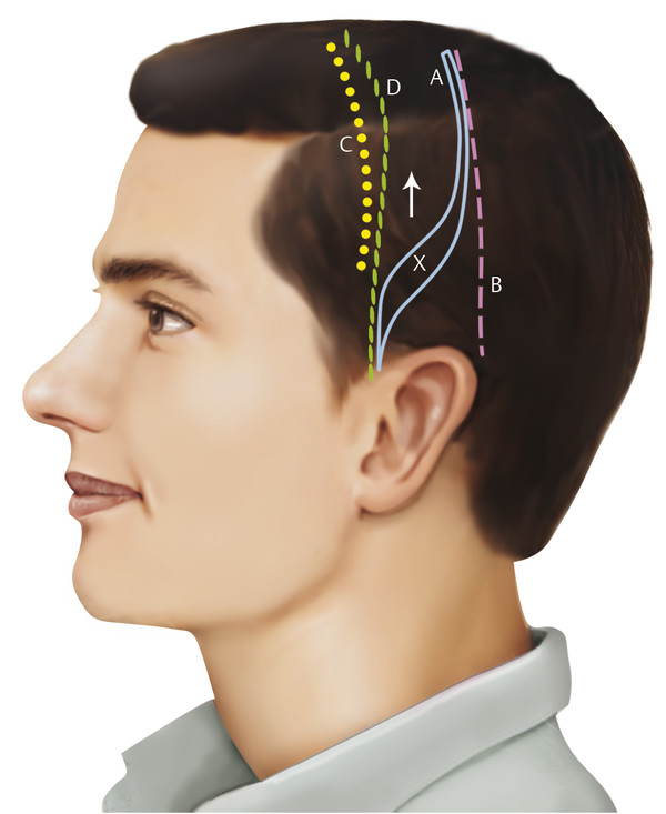 If the temporal portion of the foreheadplasty incision is turned posteriorly (Fig. 10.3, solid line A), proper shift of the forehead flap (superiorly only) will result in a defect that cannot be closed (Fig. 10.3, defect X). Such an incision will force compromised elevation of the lateral brow and necessitate undesirable posterolateral shift of the flap and the temporal hairline. A postauricular positioning of the temporal portion of the forehead lift incision (Fig. 10.3, pink dashed line B) will result in a compromised effect on the temple and upper lateral face owing to tethering of the flap at the ear. A short preauricular incision (Fig. 10.3, dotted line C) has a similar drawback.