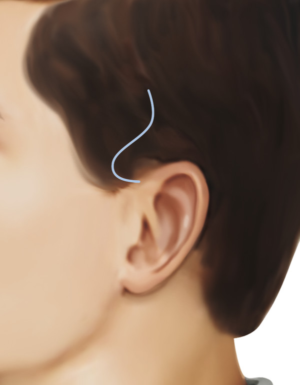 A preauricular positioning of the temporal portion of the foreheadplasty incision beginning anterior to the root of the ear and extending directly superiorly eliminates these problems (Fig. 10.3, green dashed line D). If a facelift is to be performed concurrently with a foreheadplasty (or subsequent to it), a small hair-bearing projection of the temporal scalp is preserved to prevent a shift of hairless preauricular skin into the temporal hair (Fig. 10.4). Frequently, this occurrence is mistakenly interpreted as “a wide scar.”