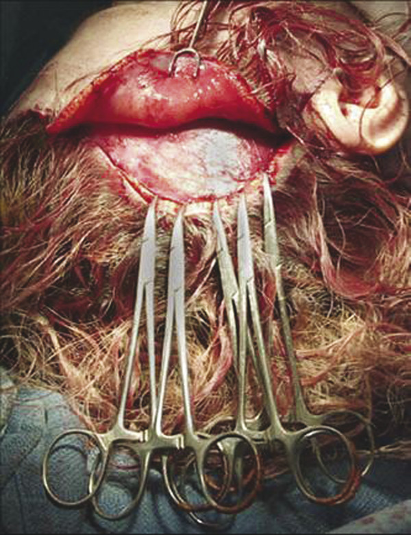 The scalp incision goes down to the galea, which is divided with scissors. Bleeding will be encountered laterally over the temporal region. Cautery should be used carefully at superficial levels and avoided near the plane of hair follicles to prevent peri-incisional alopecia. Bleeding from superficial areas of the edge of the posterior flap is best managed by applying a hemostat to the galea and allowing it to drape posteriorly, which compresses the flap edge (Fig. 10.6). Neurosurgical hemostatic clips work well on the anterior flap but in practice are a bit more cumbersome to use posteriorly. Cautery can be used along the edge of the anterior flap where skin or scalp will be resected. Scalp is never excised from the lateral portion of the anterior or posterior flaps, and cautery should not be used near follicles in these areas.