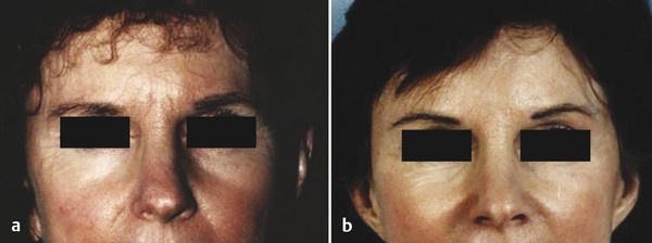 A frequent error is performing an upper lid blepharoplasty when a foreheadplasty is needed. This mistake is due to using a memorized technique rather than anatomical analysis. As the upper face ages and the brow descends, brow skin will move into the orbit, producing an illusion of eyelid skin redundancy known as “pseudoblepharochalasis” (Fig. 10.1). Attempts to treat pseudoblepharochalasis with traditional blepharoplasty techniques will result in a sad, tired-appearing patient with smooth eyelids and a visible scar extending onto the lateral periorbital region, and it may cause difficulty closing the eyes during sleep.
