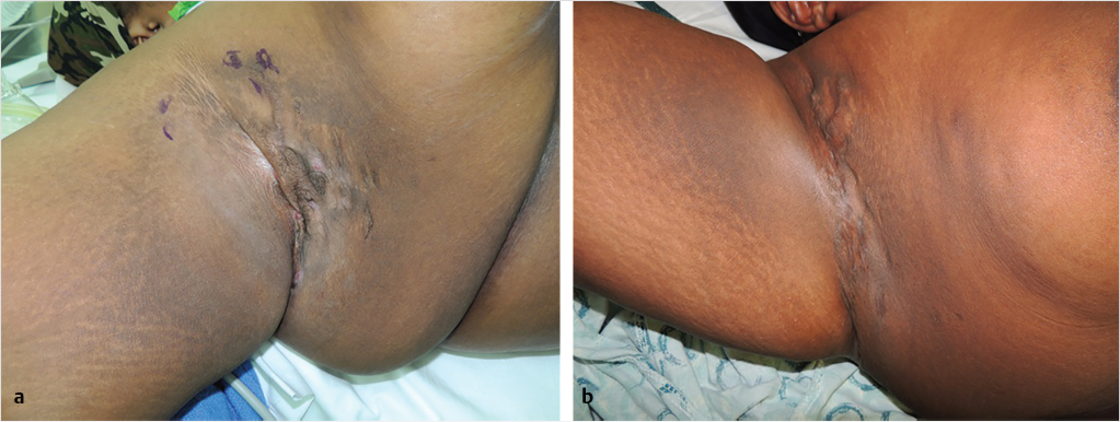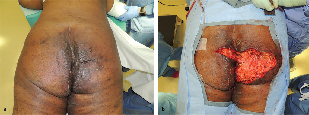In general, wound healing of the axilla, breast, and inguinal areas is better than perineal and gluteal regions. Kagan et al, developed an algorithm for surgical resection of hidradenitis by area of involvement. 17 In this study, patients with limited disease of the axilla, breast, and inguinal region were given excision and primary closure, and those with extensive disease were treated with excision and skin grafting or excision alone with closure by secondary intention. Patients with limited disease in the perianal region and buttocks, however, were treated by excision only with healing by secondary intention. Patients with extensive perianal and gluteal involvement were treated with excision and staged grafting.