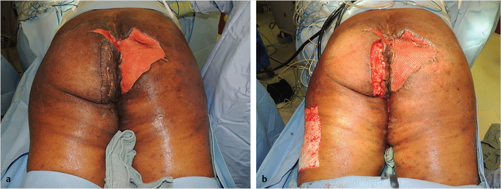 For larger resections, if a skin graft is used to reconstruct the defect, a bolster dressing or a negative pressure vacuum-assisted wound dressing (wound VAC) is typically placed for compression to avoid a shear injury and allow the graft to contour to an often irregular surface area. The bolster or wound VAC is left in place for 5 to 7 days. However, it should be taken into consideration that at times an adequate seal with a negative pressure dressing is not achievable in certain anatomical areas, for example, the perianal area. Fecal diversion is rarely undertaken for perianal and perineal hidradenitis.