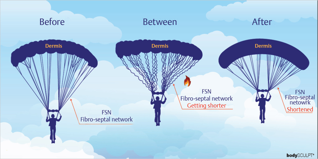Contraction of the collagen fibers occurs at different temperatures depending on the type of collagen. The optimal temperature for collagen contracture has been reported to be 60–80°C. 4 This contraction does not necessarily cause connective tissue damage but instead induces a restructuring effect of the collagen fiber framework. Once the tissue reaches the threshold temperature it immediately undergoes contraction in a dramatic fashion. This effect has been described in studies of the cornea, cartilage, and vascular tissue in the past. RF energy is applied internally directly to the deep adipose and subcutaneous tissue with lower heat levels applied to the dermis. This results in tissue contraction that occurs mainly due to the contribution of deeper adipo-fascial layers. Specifically, heating of the Fibro-Septal Network (FSN) leads to dermal contraction (▶Fig. 10.1).