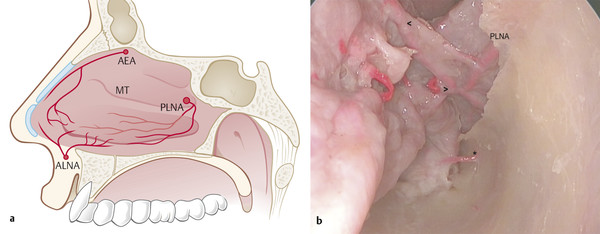 Fig. 11.1 (a) Scheme of the inferior turbinate vascularization. AEA, anterior ethmoidal artery; ANLA, anterior lateral nasal artery (branch of the facial artery); MT, middle turbinate; PLNA, posterior lateral nasal artery. (b) Endoscopic photograph of the inferior turbinate arteries. PLNA, posterior lateral nasal artery; <, superior lateral inferior turbinate artery; >, inferior medial inferior turbinate artery; *, branch of the descending palatine artery to the inferior turbinate.