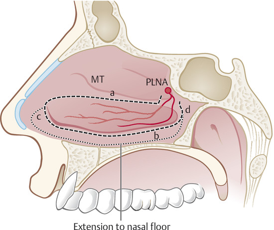 Fig. 11.2 Posteriorly based inferior turbinate flap (pITF). Schematic drawing showing the incision to raise a pITF. Care must be taken when performing the posterior incision as the PLNA runs just anteriorly to the place where the posterior incision is made. MT, middle turbinate; PLNA, posterior lateral nasal artery; a, superior incision; b, inferior incision; c, anterior incision; d posterior incision.