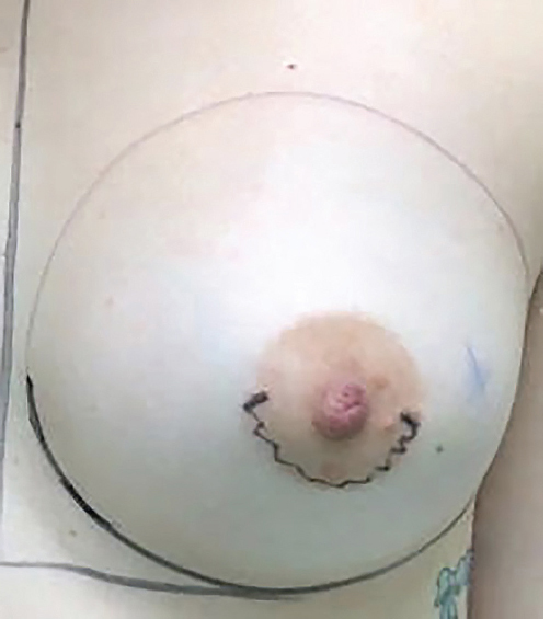 Incision markings are performed in inferior half of NAC inside the areola skin, in zigzag shape, avoiding surrounding skin. The length of zigzag must be short to provide a hidden scar (0.5 cm each peaks and valleys). End parts of incision are at 3 and 9 o’clock in areola directing to nipple to avoid intraoperative damage to the skin (Fig. 11‑1).