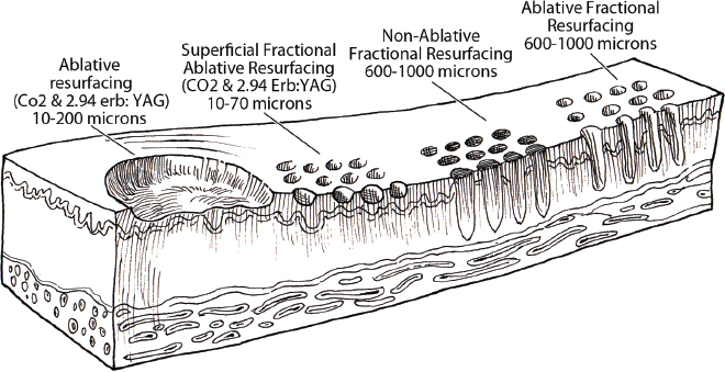 The fractional laser devices available today can be broken down into two types: ablative and nonablative. The ablative devices include CO2 (10,600 nm), yttrium-scandium-gallium-garnet (YSGG; 2,790 nm), and erbium-doped yttrium-aluminum-garnet (Er:YAG; 2,940 nm) lasers. The chromophore or target for these lasers is water in the epidermal and dermal skin layers. These high-energy lasers instantly heat the water, causing vaporization of the treated tissue with each pulse. This creates wound columns that can initially have some bleeding, serous drainage, and swelling lasting approximately a week or until reepithelialization is complete. The duration of erythema postfractional ablative resurfacing varies, but it typically lasts from 3 to 7 days.