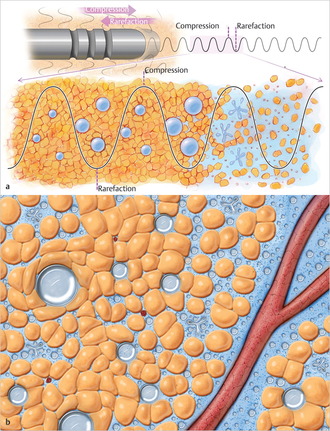 Fig. 11.2 Fat emulsification: VASER system gets advantage of ultrasound energy and vibration to disrupt the adipose supporting tissue (a). Compression over the fatty tissue through vibrating ultrasound energy and the rarefaction that is pulled back allows the adipose cell liberation from the connective tissue. This will allow easier and safer fat extraction without injuring noble structures (b).