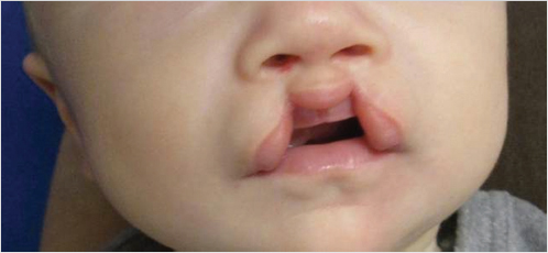 There are differing levels of cleft severity, including incomplete clefts all the way to very wide complete clefts. They may be unilateral or bilateral. Larger width clefts will have a greater impact on the nasal and alveolar deformity. Fig. 12‑1 is an example of an incomplete unilateral cleft lip, while Fig. 12‑2 shows a unilateral complete cleft lip. Fig. 12‑3 and Fig. 12‑4 are examples of an incomplete bilateral and complete bilateral cleft lip, respectively. Assessment of the cleft width is necessary in order to determine the need and type of presurgical molding. It is imperative to determine the ability and means for each parent to follow through on presurgical treatment. Time and financial constraints will prevent good outcomes due to patient inability to attend clinic to monitor the success of the treatment.