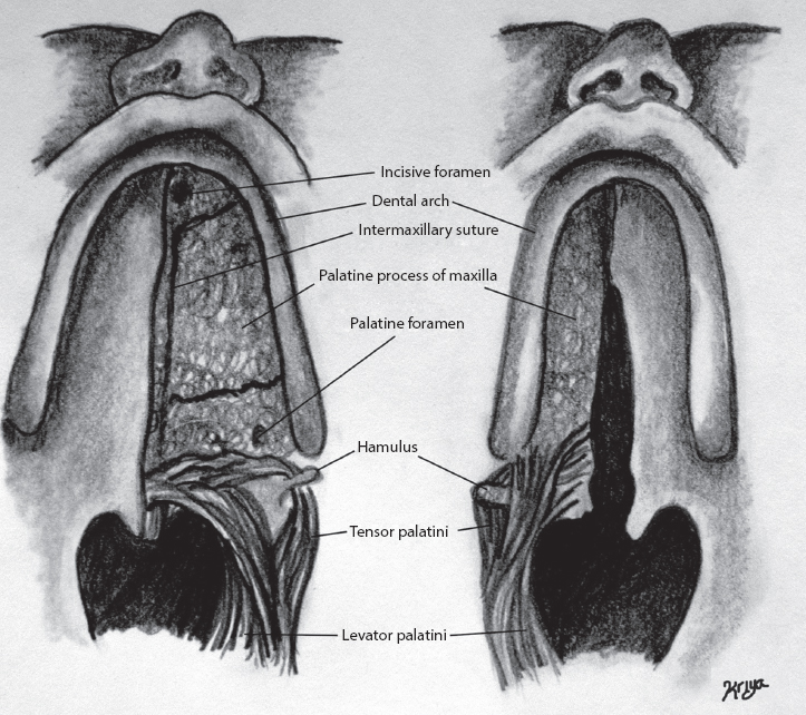 2. Lateral limbs of the Z on the oral mucosa should extend to the hamuli so that one of the lateral limbs lies along the posterior margin of the hard palate (Figure 12.2a).