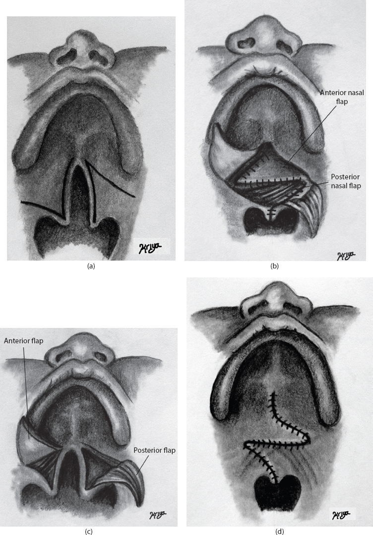 Figure 12.2 Furlow double-opposing Z-plasty. (a) Preoperative markings. (b) Elevation of anterior flap (oral mucosa only) and posterior flap (containing palatal muscle). (c) Closure of the anterior nasal mucosa flap and the posterior nasal myomucosal flap. (d) Closure of oral mucosal flaps.