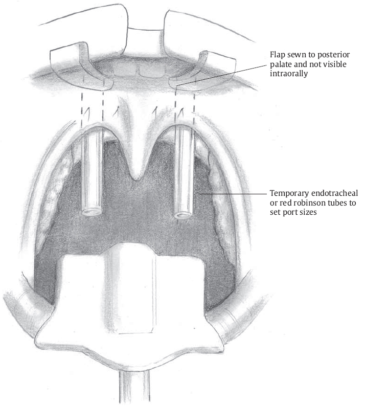 A final check of the position of the flap and size of the ports is undertaken ( Fig. 12.4 ). The flap should not be visible from the oral cavity, as it needs to be high in the nasopharynx.