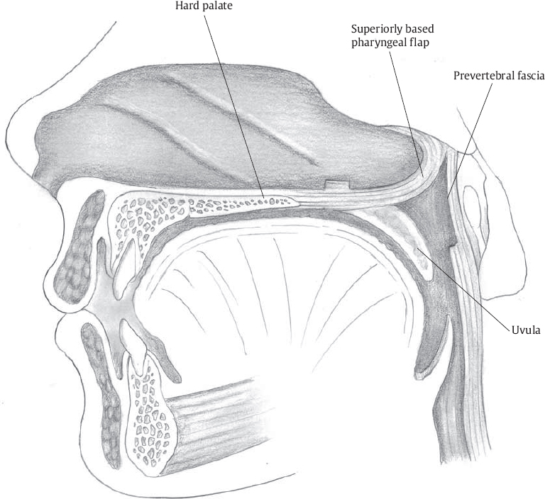 The superiorly based pharyngeal flap is elevated by incising down to the prevertebral fascia. This fascial layer is bright white in color, and the plane will be essentially avascular. It can generally be elevated bluntly after the inferior incision is completed. The flap should be elevated high into the nasopharynx. Hemostasis can be accomplished with monopolar cautery.