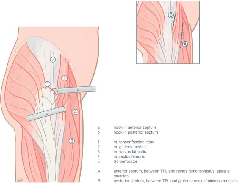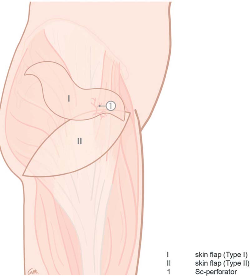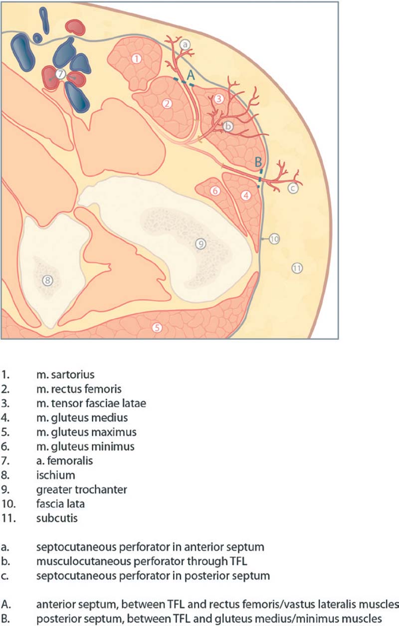 • Type 3: flaps based on septocutaneous perforators running in the posterior septum of the TFL (between the TFL and the gluteus medius/ minimus muscles)