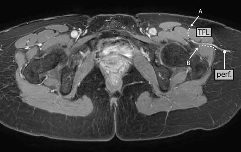 Fig. 13.3 Magnetic resonance angiography (MRA) axial view. A, anterior septum; B, posterior septum; TFL, tensor fasciae latae muscle; perf, posterior septocutaneous perforator.