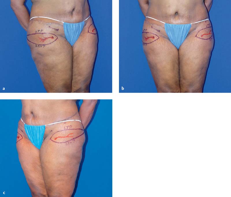 Fig. 13.5 Thighs marked for lateral thigh flap. (a) Right oblique view. (b) Anterior view. (c) Left oblique view.