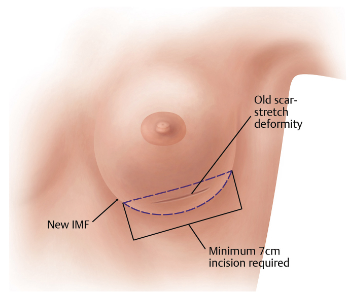 After defining the exact nature of the deformity, and these key relationships, incision planning is performed to set the final incision in the new IMF. The new implant size and shape may also play a part in the new IMF position. These relationships of implant size range and ideal N-IMF have been determined. A 7-cm incision, or larger if a skin resection is planned, is then confirmed intraoperatively with the skin on maximal stretch. Redundant skin or skin removal to match the N-IMF distance bilaterally should be marked out and included in the initial incision wedge. This is one distinction between a stretch deformity and IMF fold malposition. If a stretch component is present, a wedge of additional skin should be resected to rebalance the breast and create a “hand-in-glove” volume to skin match.